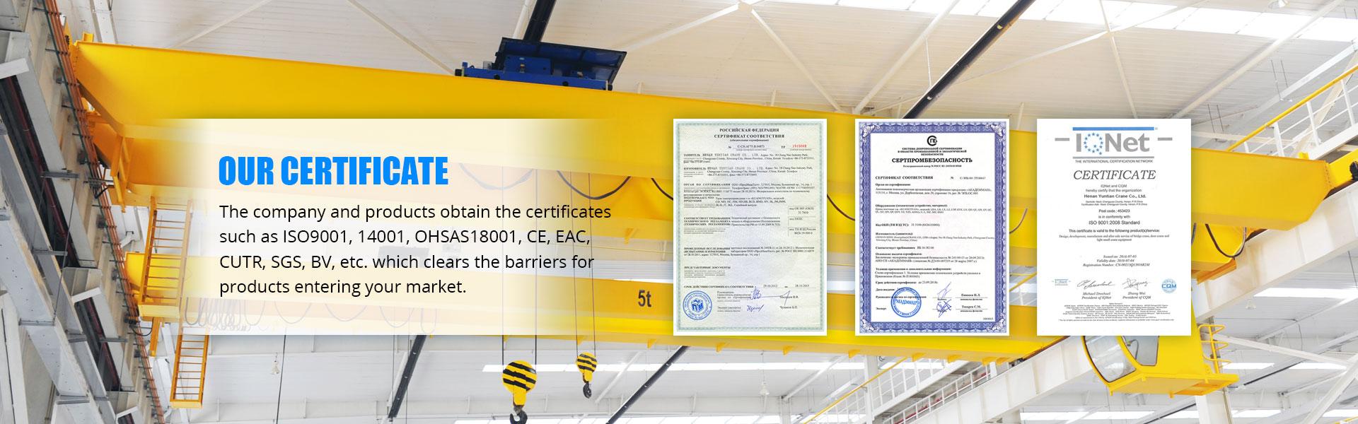 Θα μπορούσαμε να σας προμηθεύσουμε όλα τα είδη των βιομηχανικών γερανών από 0.25tons σε 900tons, pass GB / T 19001-2000 idt ISO 9001: 2000, GB / T 24001-2004 idt ISO 14001: 2004, GB / T 28001-2001, OHSAS 18001: 1999, CE, GOST, SGS, TUV, BV και ούτω καθεξής.